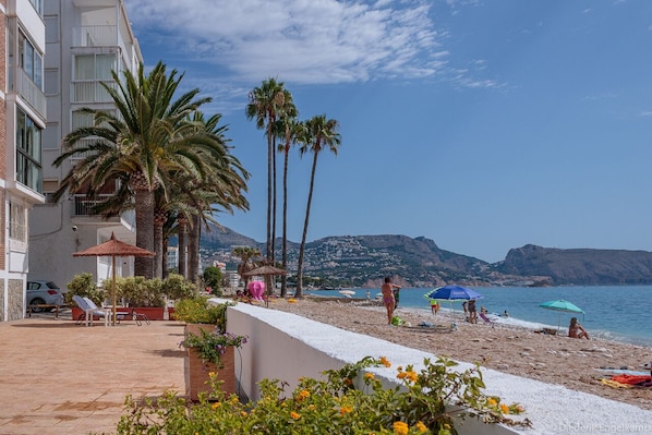 The building is situated in a unique location, right on the beach and offers the best view of the sea. The shopping area and the boulevard are just a 10-minute walk away. Water shoes are recommended for the pebble beach in front of the apartment. Near the building you will find the small river 'Rio Algar', which offers beautiful walking routes that lead to the boulevard and the old town of Altea. During the summer period, next to the building, there is a 'Chiringuito', called 'Bon Vida', where you can enjoy delicious tapas and cold beer and drinks.