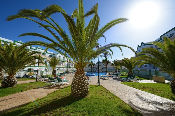 As you open the door your first impression is of the large elegant pool area with palm trees, grass areas, deck chairs, and, the main attraction, the crystal clear pool with its decorative water fountain at one end, helping you relax whilst you listen to the water trickle down into the pool.