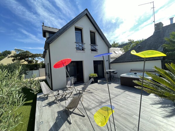Ty Jean is one of three adjacent detached holiday homes known as Tri Martolod. The location is excellent - an easy walk to both the centre of Arradon (boulangerie, shops, restaurants) and to the coast (a variety of lovely walks and a couple more restaurants). It's just a few minutes' drive from a hypermarket and a few more to the expressway. The house is well equipped for 4, and especially including the big garden / deck area, very spacious. It's reasonably private, though overlooked from one room of the adjacent property. Excellent beds and bathrooms, dining chairs not quite so comfy! Spa well maintained and very relaxing. The charming (English-speaking) owners live next door and go out of their way to make you welcome. They are happy to make suggestions but don't intrude. Do ask questions and deal with them directly from the outset. We thoroughly enjoyed our stay and hope to return. One week certainly isn't enough to explore this interesting and varied area of Brittany.
