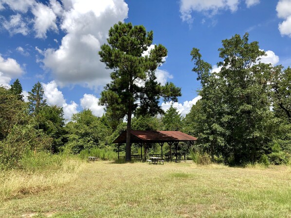 RV site with full hookups (30 amp) on a secluded, private church camp across the highway from Henderson County Fairgrounds. Fire ring with grill, bath house, pavilions, outdoor rec options, private lake, and hiking trails all included!