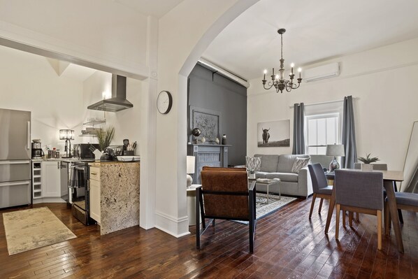 The Dobbs Full Building – All 4 Units Combined, 3,800 Sq Feet. Up to 14 guests. Featuring (4X) chef’s kitchens, (3X) Living / Dining Areas, (4X) Bathrooms, (5X) Bedrooms, 2 Bedroom Studio. (4X) 65” Smart LG TV’s, (4X) 55” Smart LV TV’s. Google Fiber High Speed Internet connected.