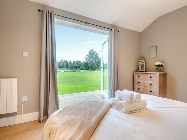 Bedroom 2: Zip And Link Super Kingsize Bed (2 x Singles On Request) Ensuite: Cubicle Shower, Heated Towel Rail, Toilet. Electric central heating, electricity, bed linen, towels, Wi-Fi and fuel for wood burner included. Travel cot. Welcome pack. Garden with decking area and garden furniture. Private parking for 2 cars. No smoking. Please note: There are 2 steps in the garden and lakes in the grounds.. A lakeside lodge with outside bath, nestled in 6 acres of meadows backed by woodland with a private lake just for you. Surrounded by abundant bird and wildlife, this is the perfect setting for a romantic and tranquil getaway.