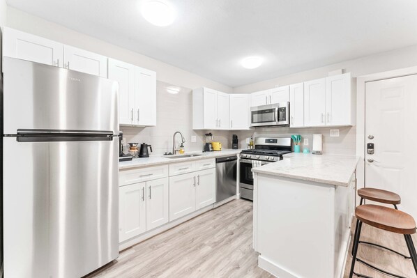 - Fully-equipped kitchen with pots & pans, bakeware, dinnerware, silverware, cookware, blender, toaster, and more!
