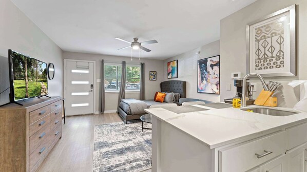 - FireTV-enabled 42” smart TV in living room with complimentary access to live cable (YouTubeTV), Disney+, Amazon Prime Video, HBO Max, Hulu, and ESPN+ for all your binge-watching needs