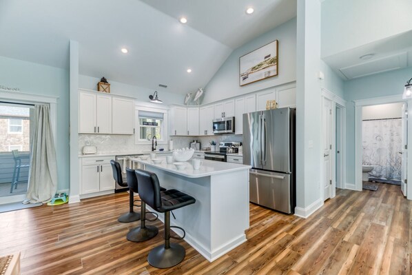 The beautifully decorated great room offers plenty of comfortable seating in a warm, welcoming environment. The dining area offers seating for six, and the stunning open, custom, well-stocked kitchen offers additional countertop seating for three, as well as a convenient dishwasher and microwave.