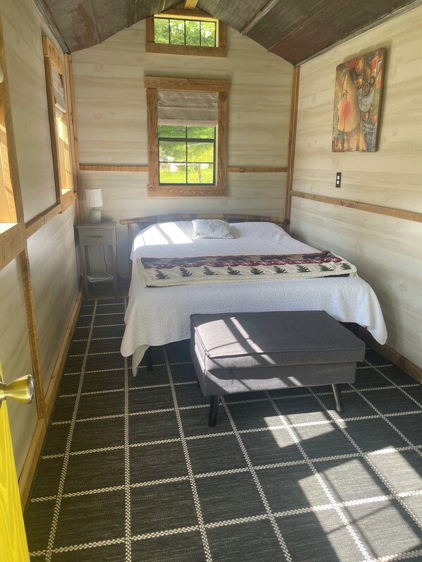 The cabin is equipped with a comfortable queen bed, offering a cozy retreat for two guests. If you plan to accommodate more, just inform us beforehand, and we'll gladly arrange additional cots or a tent for a supplementary charge (remember to bring your sleeping bags for the cots or extra cabin!).