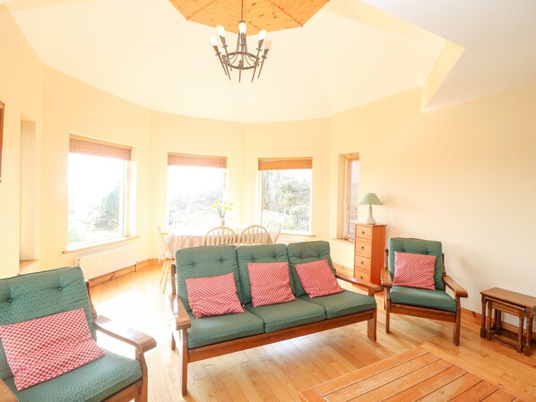 Amenities: Oil central heating with open fire. Electric oven and hob, microwave, fridge, freezer, washing machine, tumble dryer, dishwasher, 2 x TVs (one with Free-to-air channels, one with Saorview), WiFi, DVD, CD/radio, selection of books and DVDs. Fuel and power charged by meter reading (first 30 inc. in rent), starter pack for fire inc. in rent. Bed linen and towels inc. in rent. Travel cot and highchair on request. Ample off road parking. Large lawned garden to front and rear with patio, decking, furniture, orchard. BBQ. One well-behaved dog welcome. Sorry, no smoking. Shops and pubs 2 miles. Please note - There are 4 security cameras recently installed, covering the front, rear and sides of the property. Whilst guests are in, there will be no continuous monitoring and data will be reviewed only if there is an incident. Data will be deleted 30 days after recording. Please note - As guests, you will be responsible for your own refuse during your stay, there is no longer a refuse collection that visits the property, details will be provided by the owner