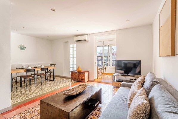 Roger de Flor is a comfortable 2-bedroom apartment located next to Plaza Tetuan, next to the heart of Barcelona and the historical district of Arc de Triomf. The apartment can accommodate up to 6 guests, with a living area that features a relaxing sofa and a flat screen TV, dining area, and fully-equipped kitchen with all the appliances.