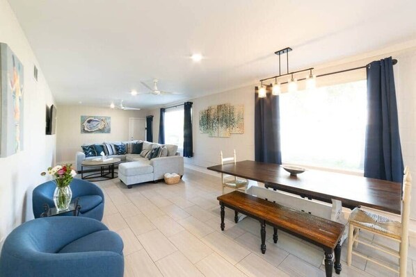 Pet-friendly, spacious Bay St. Louis retreat created by renting both Blaizy Dayz and Sunkissed together. This four-bedroom, three-bath home is connected by an interior door (unlocked for combined stays) and offers room to relax together while still enjoying privacy. One full kitchen plus a kitchenette, walk-in showers, and optional shared golf cart rental (additional fee, subject to availability). Walkable to Old Town and a short walk to the beach.