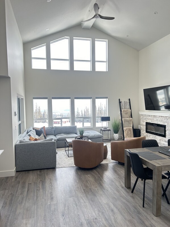 Spectacular views of the Monashee Mountains from this brand new top floor 3 bed/2 bath chalet. Bring the whole family including the dog, to enjoy this tastefully decorated unit with a fully equipped kitchen and dining room, fireplace, 5 person hot tub overlooking the skating rink, comfortable living room with down sectional sofa and two swivel chairs. The main bedroom boasts a king size bed and a beautiful ensuite with steam shower. The second bedroom has a cozy queen size bed and is next door to the hall bath. Off the kitchen is the kids room with full size bunk beds and a queen size sleeper sofa. When it is time to get outside you are steps to the gondola, tube run, children’s ski school, beginner ski run, skidoo rentals, dogs sled tours, horse drawn sleigh tours, and skating rink.