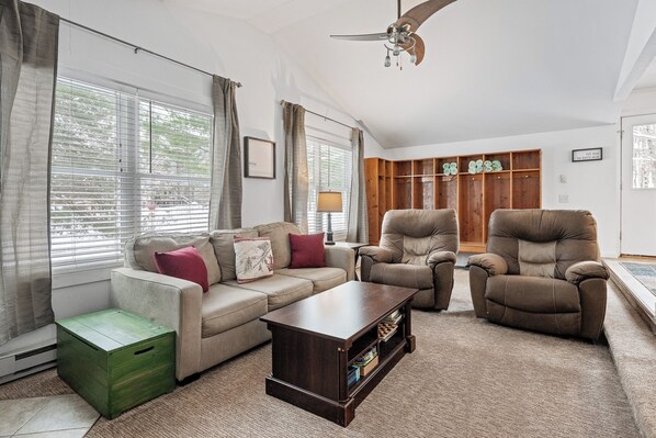 Upper Oasis: Find sanctuary in an additional bunk room, private bathroom, and a dedicated family lounge. It's the perfect spot for the kids to have their own space. With a sofa that doubles as a sleeper, a TV, and games, it's the perfect nook for leisure. Plus, step out onto the deck and soak in the wooded views and ski hill just beyond!