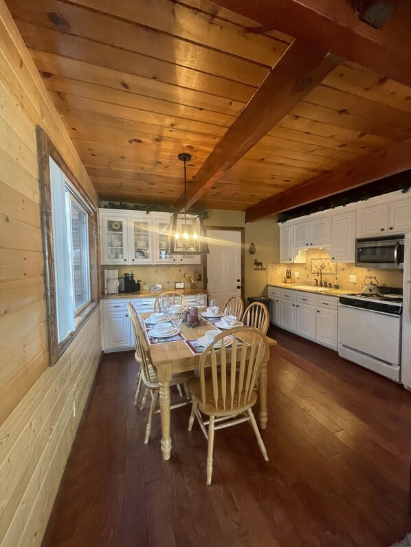 The Space: Come back and indulge in the beautiful craftsmanship of the space with wood log finishings and cozy up next to the wood-burning freestanding stove while watching the snow through double pane windows. Embrace all 4 seasons from the front porch or backyard brick patio. Fall is the perfect time to enjoy the landscaping on this property with 5 maple and oak trees boasting orange, red, and yellow colors amongst the pines. This cabin has it all for your next mountain getaway! Custom home merging both farmhouse and log cabin. Fully stocked with linens, towels, and a private interior washer and dryer. Everything you will need in the kitchen to cook a meal. All you need to bring are your groceries and personal items. Spacious living room with queen fold-out couch. Downstairs bathroom with painted brick walls and barnyard vanity. Upstairs features two large bedrooms with queen log cabin style beds. Outside has a barbecue grill, outdoor chairs, and a paved 2-car driveway. Full access to the entire interior and exterior of the property excluding one indoor utility closet and shed located in the backyard. Starter amounts of dish soap, hand soap, laundry detergent, and toilet paper are provided. Additionally, a welcome basket with starter amounts of coffee, hot chocolate, and apple cider is provided.