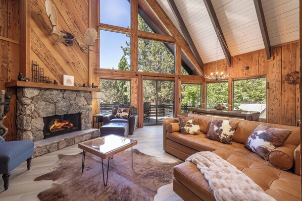 Escape to Kookaburra Cabin, a unique A-Frame retreat in the Lower Moonridge area of Big Bear Lake. Unwind in this beautifully renovated 3-bedroom chalet with a cozy living room and gas burning fireplace, or relax on the front deck with propane firepit and BBQ grill.