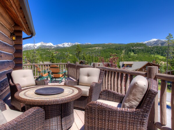 With signature Spanish Peaks views on all sides and serene mountain surroundings, this luxurious Powder Ridge log cabin makes the perfect Big Sky vacation destination. Quietly situated within the Powder Ridge development, yet only a few minutes from the Mountain Village, enjoy ski-in/ski-out access to the biggest skiing in America. In summer, opportunities for hiking, biking, and wildlife watching abound! An ideal fit for multiple families, up to 5 vacationing couples, or a group getaway, this 3,500 sq. foot, 5 bedroom home provides plenty of well-appointed space to gather or spread out, in style. We also manage several nearby properties to accommodate larger parties. The cozy, cabin-in-the-woods exterior gives way inside to high-end amenities, elegant furnishings, and modern conveniences throughout. Prepare to be WOWed! Featuring a Wolf stove, Sub Zero refrigerator, lower level game room, and bonus space, and a custom bunk room, this lavish abode has all the comforts of home (and then some) in a mountain paradise. Cap off an epic day with a starlit soak in the amazing outdoor hot tub. Just a quick jaunt from Lone Mountain, and only 45 scenic miles from West Yellowstone, this retreat in the Rockies is your base camp to Montana-made memories and fun for everyone!