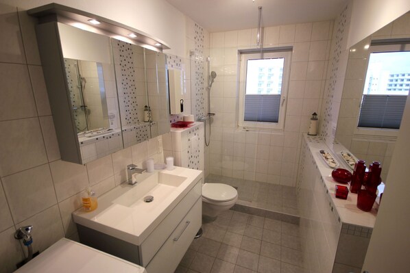 Your bright and lovingly furnished non-smoking apartment 36RB51 is located on the 3rd Upper floor of the house and has a south-facing balcony. The 3 room apartment has a size of approx. 72 qm and can be used by up to 4 people. In addition to the cozy living room with flat-screen TV, DVD player, sound system, free internet access and comfortable seating area, there are two bedrooms, a separate kitchen, a hallway and a bathroom with a vanity, walk-in shower, toilet and washing machine. The master bedroom is furnished with a double bed, a wardrobe, a dressing table and a small reading corner. The second bedroom has a sofa bed for 2 more people, a wardrobe and a flat-screen TV. The kitchen is fully equipped with a dishwasher, oven, ceramic hob, fridge with small freezer compartment, dining table for 4 people, coffee machine and toaster. You park your car on the apartment's own parking space at the house.