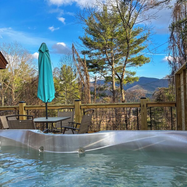 This is the perfect location between Ellijay and Blue Ridge. Relax in our beautiful, private hot tub on our newly renovated deck, enjoying nature and the stunning scenery. Hot tub operates year round.