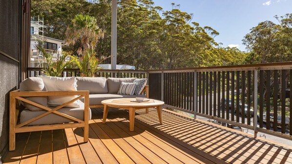 Step into the modern beach house, The Point, where contemporary furnishings and a spacious open-plan living area create an inviting atmosphere. Nestled between bush and beach, unwind with the soothing sounds of surf and birdsong while enjoying luxurious amenities such as an outdoor hot shower, bathtub in the ensuite, Wi-Fi and airconditioning.