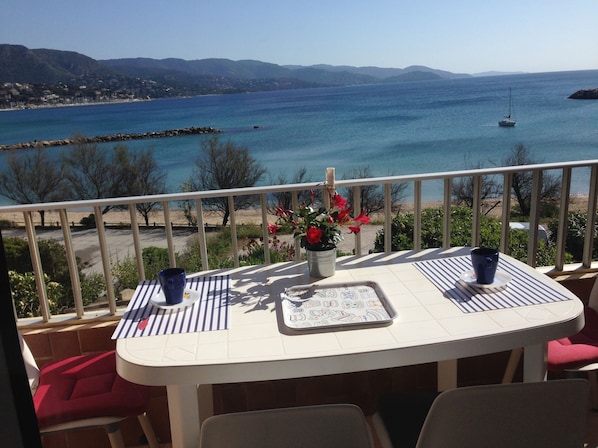 Excellent séjour dans cet appartement au bord de la plage, calme et à l'abri du mistral. Vue de la terrasse sur toute la baie