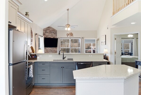 Inside, find a haven of comfort and style, with each of the 3 bedrooms featuring a luxurious King bed, complemented by additional sleeping options including a Queen Sleeper Sofa in the living room and sunroom. The fully equipped kitchen beckons culinary adventures with modern appliances and convenient extras like a Keurig and Crockpot. The sunroom, adorned with a wet bar and sweeping lake views, creates an ideal spot for relaxation.