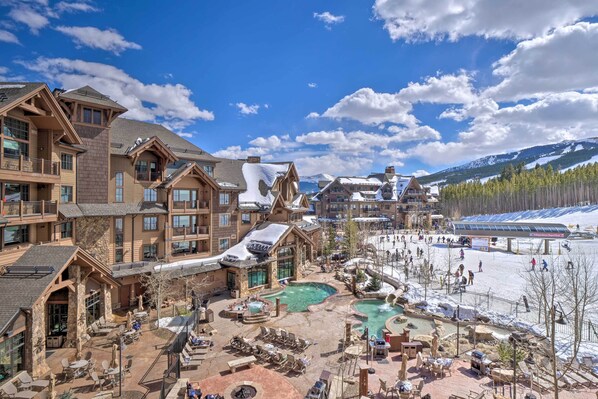This is an amazing New Years Week rental of a slopeside 2 bedroom, 2 bath Penthouse resort condominium in the finest, true ski-in and ski-out resort in Breckenridge, CO. The unit you are renting sleeps 8 and is a penthouse 4th Floor unit with a direct view of the slopes! The unit itself is a 1200 square foot split plan unit which has a king in the master bedroom and a walk-in shower and tub and toilet on the master side of the unit. Separating the two sides of this condo is a large full-size kitchen with a granite eat-in countertop with 3 seats and a dining table and a living room off of the kitchen. The living room has a leather sofa and a chair and the sofa is a pull-out queen sleeper sofa. There is a washer and dryer in the unit for your use as well as starter soap for your convenience. The kitchen has a full size refrigerator, traditional regular coffee maker and a toaster oven, range and stove and microwave and a dishwasher and double sink. If there is anything that you need appliance wise that you do not find in the unit please pick up the room phone and ring either the front desk team or the housekeeping team and see if they can bring up anything that the kitchen does not normally stock which we likely have in housekeeping that we can bring up to you to make your stay perfect. The second bedroom is on the opposite side of the unit and has a King bed and off of this room is a full bath with tub and shower and toilet. Adjacent to the second bedroom is another room that has a pull-out queen sleeper sofa and nightstands and its own wall mounted TV as well. All sleeping areas have their own televisions hooked to cable. Thus, you have 4 Televisions in the unit for your pleasure. In the side of the unit that has the second bedroom there is a kitchenette as well. It has a small microwave, dishwasher and sink and coffee pot of its own as well as a small burner stove for your use. It has its own supply of dishes and plates and silverware to make the second side of the unit its own suite if need be. The second bedroom area can be locked off if it is desired to allow more privacy for the guests using the other half of the unit. Many guests enjoy this privacy option if they are traveling with friends or other family members who want or need some privacy during the day or evening. The rooms to the unit operate on a keyless system which allows you to either use wristbands for keys or to use your smart phone app to open the door to the unit if you desire. ASK THE FRONT DESK ATTENDANT FOR AN EXPLANATION OF THIS AMENITY FOR USE TO THE SMART PHONE APP. This is Grand Lodge on Peak 7 which is a 5-star resort property. The resort has every amenity to make your trip truly a once in a lifetime trip including beautiful breathtaking views of the mountains, indoor and outdoor heated pools, indoor and outdoor hot tubs, kiddie pool indoor, outdoor slide in pool even in the winter, fire pit outside by the slopes, adult grotto with hot tubs, steam and sauna in the facility just for adults only, full service spa on premise, concierge service, activities center for use by guests open all week, multiple on-premise movie theatres for use by guests by reservation during your stay(one use and reservation per week), fitness center, library, multiple bars on premises, on-site Sevens restaurant and bar for your convenience, game room for kids, ski lockers just off of slopes, complimentary courtesy shuttle to and from town. The resort has a full-time activities coordinator to help entertain any guests who might not be skiing. There is even an escape room on premise for use by guests of the resort for an additional charge. The resort has a Breck Sports ski rental just 10 feet from the property and 20 feet from the lift right outside the resort. This unit is in building one which is the check-in building and the unit you will rent is 4 floors above the restaurant and bar, grotto, movie theatres, game room, workout room, spa and indoor/outdoor pool with slope side pool slide and multiple indoor and outdoor hot tubs including slope side hot tubs. The check-in desk is 4 floors down and the mini sundry store is located there as well next to the check-in desk along with the concierge team. The resort has immediate access right outside the door to a super chair lift to provide immediate access to all the ski mountain has to offer! This will be a vacation to remember for a lifetime!