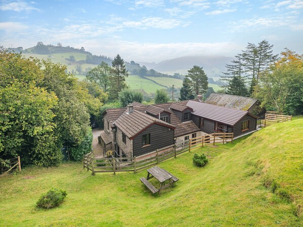 Shower Room: Cubicle Shower, Toilet. Oil central heating, electricity, bed linen, towels and Wi-fi included. Logs for woodburning stove included. Cot and highchair (available on request). Garden with patio, garden furniture and BBQ. 4-acre grounds. Bike store. Private parking. No smoking. The property has a natural water supply from a spring. Please note: Terraced grounds/gardens with steep sloping banks. Livestock may be present. This property has a security deposit of £250.. This 18th century, fully renovated Welsh longhouse is set in 4 acres of grounds, 1000 ft above sea level, on the side of the mountain Mynydd Troed in the Black Mountains. There are panoramic views from all rooms , with a public footpath leading directly onto Mynydd Troed. The property is an ideal size for large family reunions, or gatherings of large groups of friends.