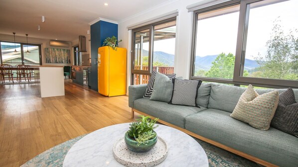 Positioned in a peaceful cul de sac, this holiday house maximises its position with ample windows, a huge deck complete with outdoor lounge, dining facilities and fire pit, all so you can relish the mountain views and relax with your family and friends.