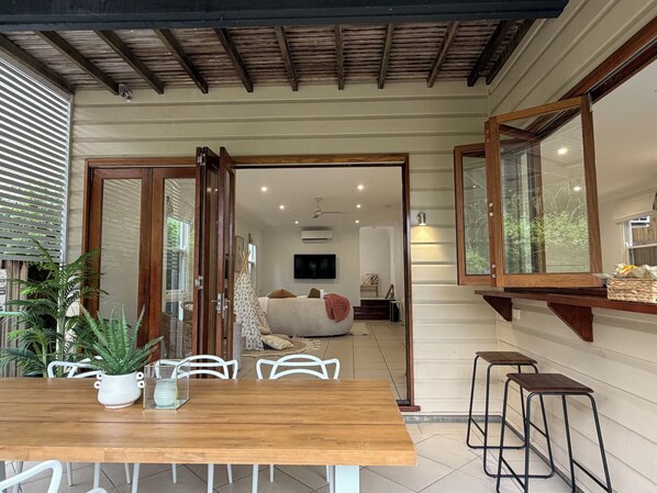 • Shaded outdoor dining area overlooking the yard