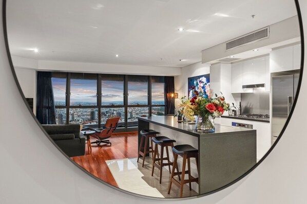 • Open-plan Lounge ~ Smart TV + Sonos soundbar, NBN unlimited WiFi, Ducted zoned Aircon, Comfy couch with Chaise + Single Eames chair & ottoman… Floor to Ceiling windows with amazing views