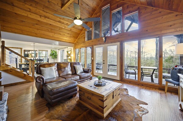 You'll enter the main level of the cabin through the fully stocked kitchen, dining and living areas. There is also a main level master ensuite. This level has an authentic rock wood burning fireplace, TV, and it's own deck just outside the double doors. The huge windows offers a beautiful view of the river.