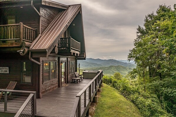 This stunning home is conveniently located between Bryson City and the Nantahala Outdoor Center, which is the perfect location for all your mountain adventures, whichever of those you may choose. Though with views like this, you might just an enjoy a vacation right at the cabin. One of the main drawing features of the home is the ability to view the long range mountain views whether you're indoors or out. There is an expansive outdoor deck that wraps the entire main level of the cabin, this is the perfect spot to enjoy morning coffe on the comfortable outdoor seating, you may want to cook a nice meal on the gas grill, gather around the firepit with s'mores and fireside stories, or take a long soothing dip in the hot tub. Each bedroom also offers a private balcony, which would be a nice spot to unwind with a book after a long day of mountain adventures.