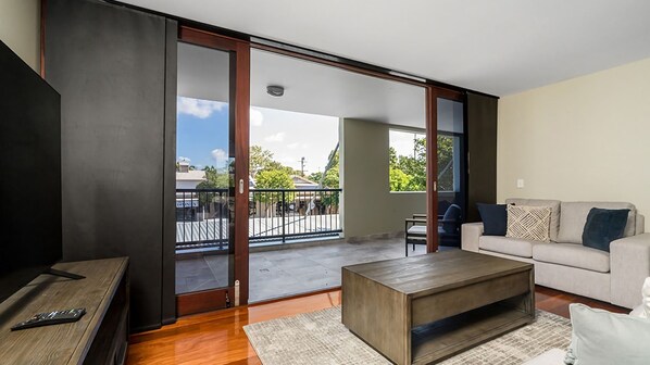 The lounge opens onto a quiet, covered balcony—an ideal spot for morning coffees or a peaceful moment to yourself. On the opposite side, a beautiful north‑facing terrace extends from the kitchen, bathed in sunshine and furnished with a generous outdoor lounge setting. It’s the perfect place for alfresco dining, afternoon lazing or entertaining with family and friends.