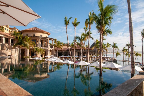 Welcome to Hacienda Beach Club & Residences, a luxurious oceanfront property on Médano Beach. Enjoy unobstructed views of the Sea of Cortez from your spacious 2-bedroom residence with elegant decor and gourmet kitchen. Stroll through beautifully landscaped grounds to the private Beach Club featuring infinity edge pools, cabanas, and poolside meal service.