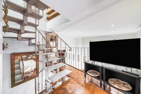 📍 Second level: Small and charming relaxation and study area, with sofa, desk and Smart TV, ideal for working or reading in peace.