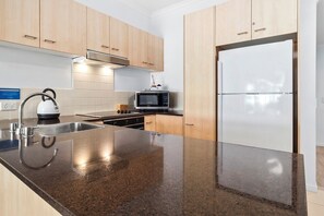 Fully equipped kitchen with cook-top, oven, microwave and dishwasher