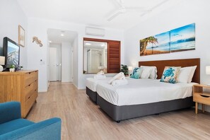 The apartment is completely self-contained with a fully equipped kitchen, laundry, spa bath, lounge and dining areas, air conditioning, ceiling fans, and a large flat-screen TV.