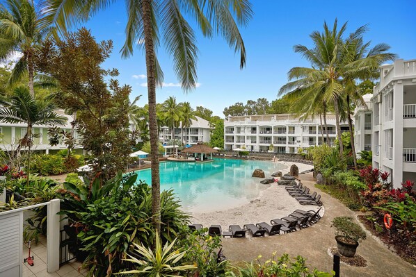 Whispering Palms at Beach Club Resort Palm Cove offers a relaxing retreat with great views of the Lagoon Pool from your private balcony. Unwind in the spacious living area, indulge in a rejuvenating spa bath or get active at the tennis court and gym. Enjoy all resort facilities including restaurants and swim-up bar.