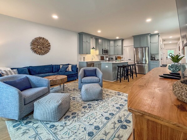 The open floor plan seamlessly connects the main living spaces, creating a warm and welcoming environment for relaxing or gathering together. The living room is designed for comfort, featuring a large, plush sofa and two rotating barrel chairs, each paired with a pillowed ottoman—perfect for lounging, reading, or enjoying movie nights on the large smart TV.