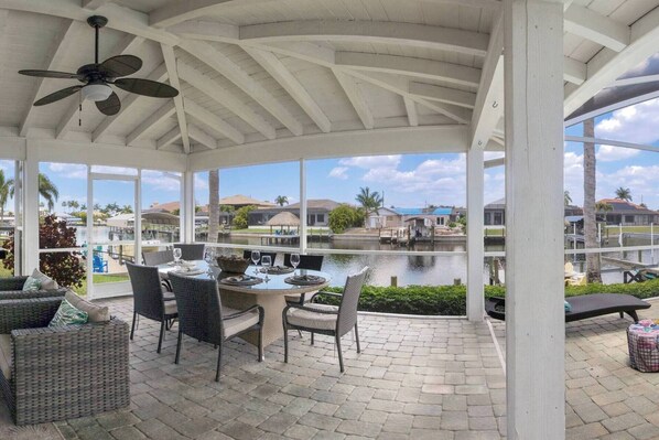 Welcome to the LANAI LIFESTYLE at beautiful Villa Coral Pearl!! This 5 bedroom 4 bathroom villa is located in a desirable SW Cape Coral neighborhood and is situated on a lovely wide canal. There are French doors along the entire back of the house that open up to an oversized lanai with sparkling pool and built-in jacuzzi hot tub. For those who want to stay out of the sun, within the lanai is a large covered outdoor screened area as well with dining table, outdoor grill, and seating area with a large TV. Inside there’s an open floor plan with new 75” TV, wet bar, and kitchen with large snack bar. The primary bedroom with its own office and ensuite and a 2nd bedroom with bath on the first floor, with 3 more bedrooms and 2 baths upstairs. Perfect floorpan for a large group! Charming interior shutters for all windows for style and privacy. Enjoy the pink skies at sunset from our brand new boat dock! Lots of parking with a spacious pavered circular driveway.