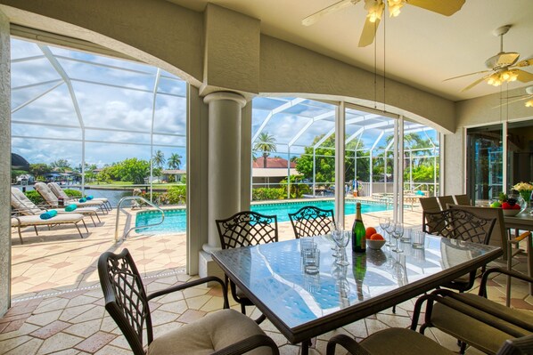 When it is time to dine, the choice is yours: Either take a seat in the living area with two dining tables – or enjoy the vista of palm trees and the canal, as the roofed section of the lanai features two more tables.