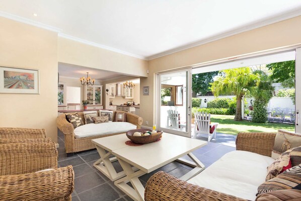 A huge, bright, and airy kitchen has everything needed for easy holiday living and entertaining. State-of-the-art appliances include a gas oven and stove, and dishwasher. A scullery houses a fridge/freezer, washing machine, and tumble dryer. A picnic-style table and benches provide a place to enjoy breakfast and easy meals. The kitchen has large windows that can be folded back to allow full views of the garden.