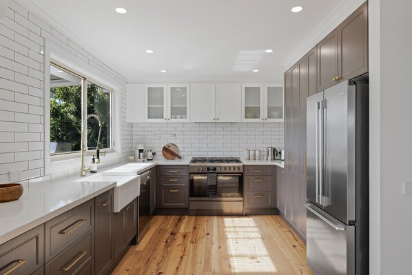 Kitchen: The kitchen is spacious and well-equipped. It has ample storage and bench space, a 6-burner gas cooker/oven, a Nespresso coffee pod machine, a milk frother, a microwave, a kettle, a toaster, a double door fridge with a freezer, and timber flooring.