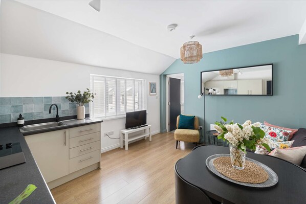 We’ve made this apartment into a really stylish space, but completely liveable too, with all the key equipment provided for your stay. The kitchen has all the essentials to whip up a home cooked meal, which can be enjoyed at the dining table and afterwards, you can relax on the sofa with a film on the flat screen.