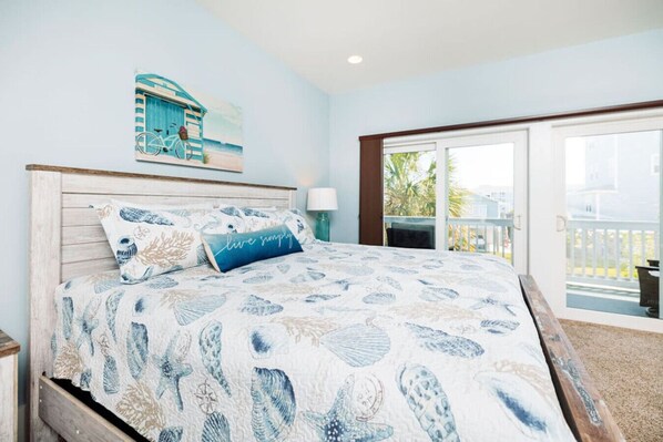 As you make your way upstairs, you pass a side door to and from the home on your right which allows quick access to the outdoor shower and a sure-fire way to ensure the sand dunes remain outside for ALL to enjoy! As the local (or express!) train continues on, an expanse of breathtaking panoramic views and sliders stop you in your tracks. The master bedroom (Bedroom #3) complete with a King size bed, ensuite bathroom (#2) with a double vanity, jacuzzi tub, and standup shower stall accompanies your private oversized East facing balcony (*complete with Sea Salt breezes at no added cost! *