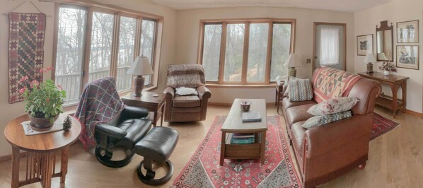 Three bedrooms (the master has a queen size bed) and two bathrooms accommodate up to seven adults. Small children are welcome. Two recently renovated bathrooms offer a walk-in shower and a tub shower with grab bars and slip resistant floors making them ideal for seniors. Seniors will also appreciate a second, two-step, entryway at the south end of the house and the single-floor layout.
