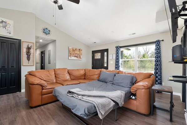 Escape to Murray Mill Ranch, a peaceful retreat nestled in a quiet country setting. Relax in the spacious open concept living room, dining room, and kitchen with high vaulted ceilings or unwind on the large back patio accessible from the dining room or master suite. With fast 400 mb internet and dozens of amenities like smart TVs in each bedroom and a fully stocked kitchen with grill available for use.