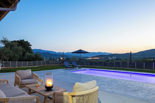 Next to the crystal-clear pool, the comfortable outdoor seating area awaits you to indulge in the moment: enjoy your morning coffee, cool off with a drink in the afternoon, or share laughter and beautiful conversations with your friends.