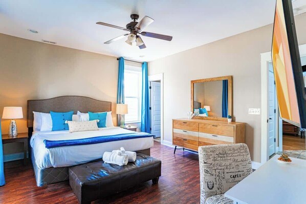 On the second floor, you'll find two curated bedrooms with dreamy king & queen mattresses, 4K smart TV, one private en-suite bath, 2nd hall bath, and closets with gold-hooked hangers.
