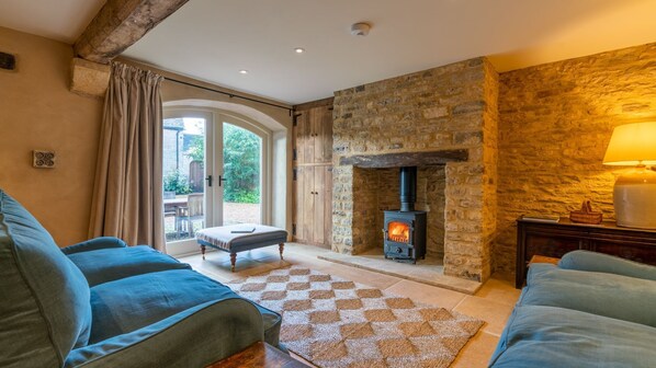 Take a moment to appreciate the detail on the old door, with its wooden acorn weight, as you walk through to the main living space. There's an eight-seater refectory dining table with chairs and a Georgian settle along one side, and two plump sofas are placed at right angles around the stone fireplace which is now home to a wood-burning stove. Behind the timber doors on the left of the chimney breast, you'll find the Smart TV. Double doors lead into the courtyard.