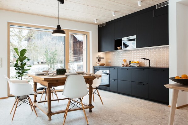 Die Ferienwohnung MAX im Erdgeschoss ist ideal für bis zu 4 Personen. Sie verfügt über eine lichtdurchflutete Küche mit einem großzügigen Essbereich, der ins offene Wohnzimmer übergeht. Von hier hat man Zugang zur Frühstücksterrasse und zum Garten, mit Trampolin und großer Wiese zum Austoben (ideal für Kinder). Von der Küche aus gelangt man auf die überdachte Süd-Loggia, mit Essplatz und Outdoor-Loungesesseln. Hier können Sie bei jedem Wetter draußen sitzen. Der Wohnbereich verfügt über zwei gemütliche Sofas, Flat-TV, Bose-Sound-System und ein Panoramafenster mit Bergblick. Das Elternschlafzimmer mit Boxspringbett und Einbauschrank ermöglicht ebenfalls den Zugang zur Ost-Terasse. Im Kinderzimmer gibt es ein Wandgemälde, das die heimischen Vögel und die Tiere des Waldes zeigt. Das exklusive Bad ist mit Regendusche, Badewanne und hochwertigen Accessoires ausgestattet. Kosenloser W-LAN Zugang und Zimmersafe gehören ebenfalls zur Ausstattung.