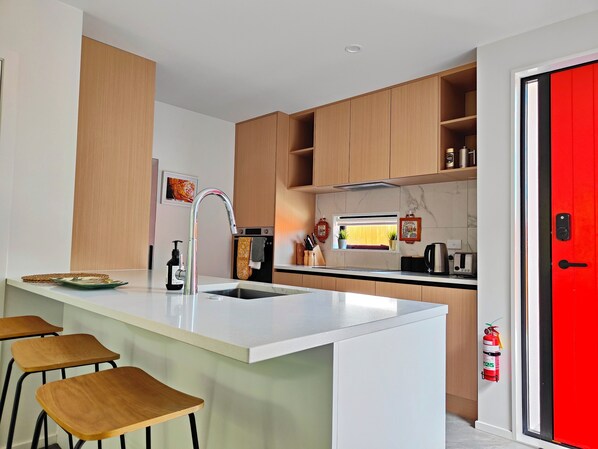 Fridge, microwave, oven, stovetop - Tranquil Bamboo Oasis -New 2 Bed Close To CBD (Christchurch)